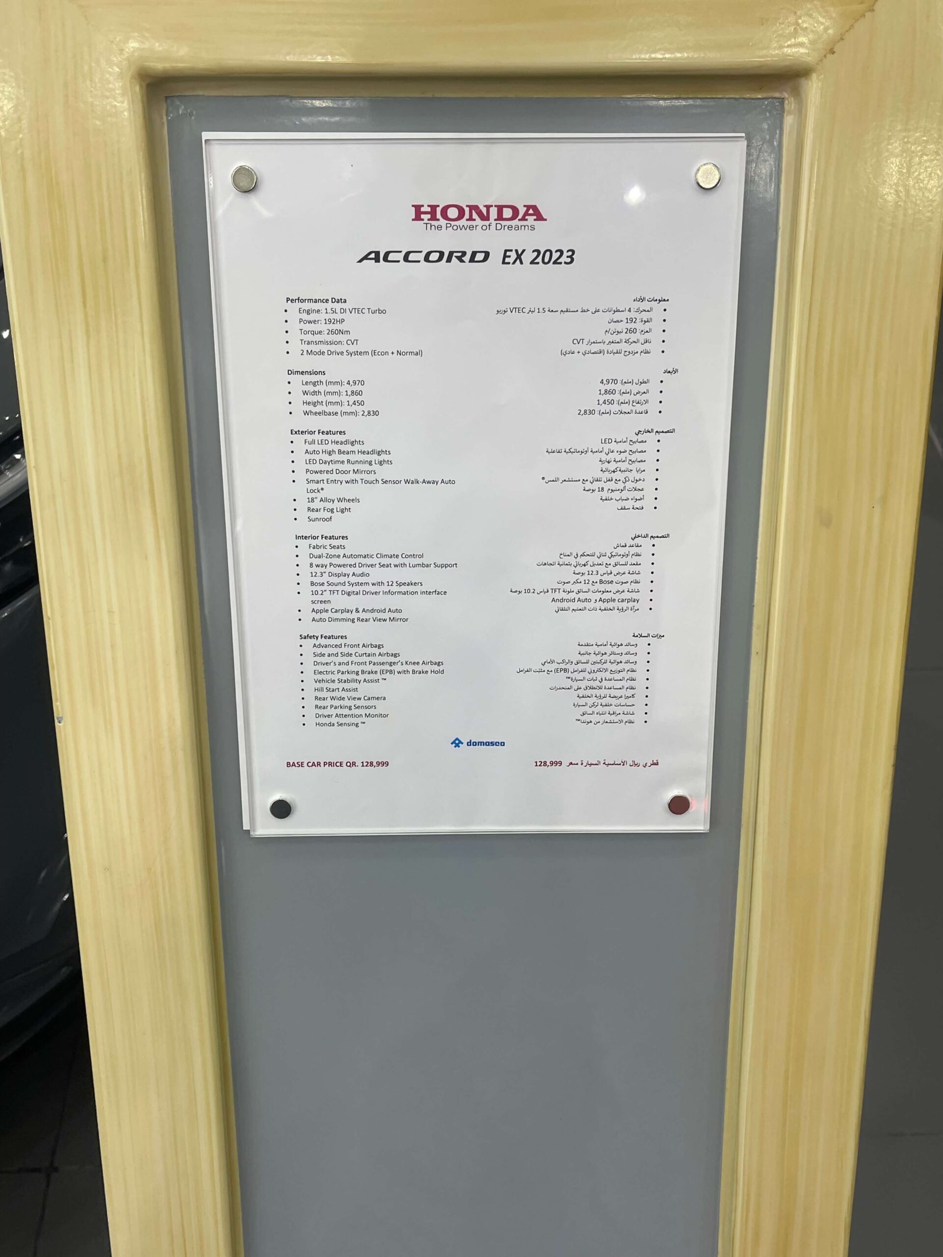 The Honda Accord EX is priced at 129,000 QAR, offering a balance of luxury and performance. This version is powered by a 1.5-liter turbocharged engine, producing a robust 192 horsepower. This powertrain ensures a thrilling driving experience, combining efficiency with the kind of power that makes city and highway driving equally enjoyable. The EX variant is also equipped with a suite of advanced safety and driver-assistance features, making it a great choice for those seeking a secure and stylish ride.